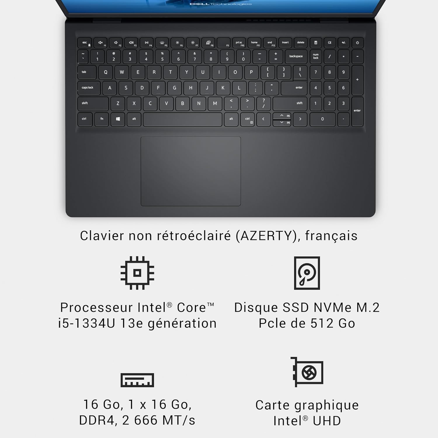 Dell 15 PC Portable DC15250 15,6" FHD (1920 x 1080) 120 Hz, Processeur Intel Core i5-1334U, Graphiques Intel UHD, 16 Go RAM, 512 Go SSD, Windows 11 Home, Clavier AZERTY
